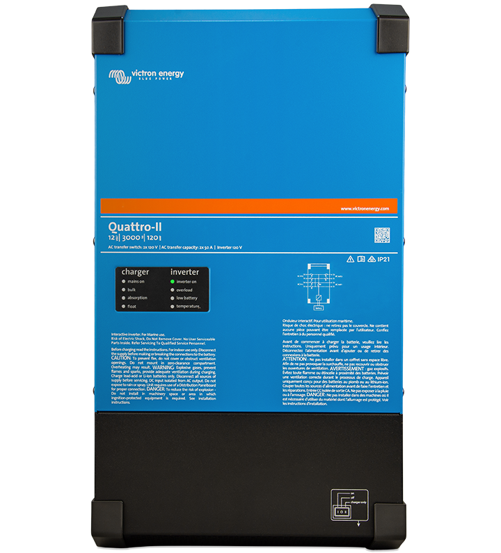 Quattro-II 12/3000/120-50/50 2x120V Victron Energy. Producto original importado. Ideal para proyectos solares en Colombia. Garantía y soporte técnico especializado.